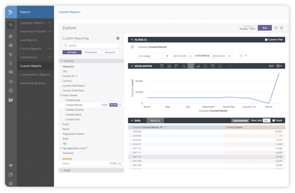 Zoals je ziet slaat ActiveCampaign een mooie brug tussen marketing en sales. Een van de mooiste functionaliteiten vind ik persoonlijk de custom report builder. Deze functionaliteit stelt je in staat om bijv. te achterhalen wat de invloed van een whitepaper is geweest op sales.