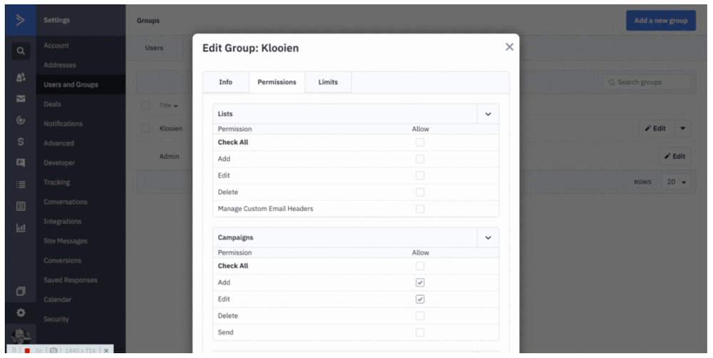 ActiveCampaign kan uitstekend binnen grote organisaties gebruikt worden door een uitgebreid rechtensysteem met gebruikersrechten en groepsrechten. Zoals je hieronder kunt zien, kun je per user of per groep de rechten per module instellen.