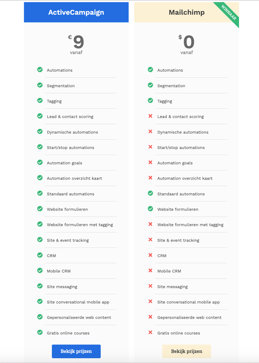 Zometeen neem ik je mee in een diepgaande vergelijking tussen Mailchimp en ActiveCampaign, maar eerst wil ik een overzicht geven van de belangrijkste verschillen.