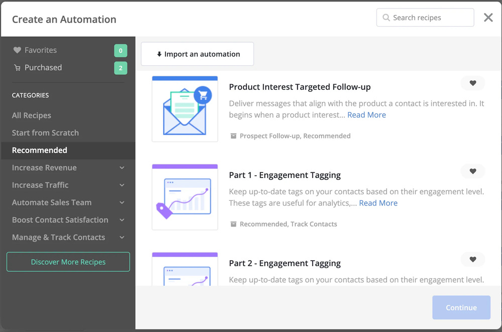 ActiveCampaign heeft niet alleen een gebruiksvriendelijke editor waarin je zelf automations kunt bouwen, maar ook nog eens een bibliotheek met honderden automations die je kunt importeren met een druk op de knop.