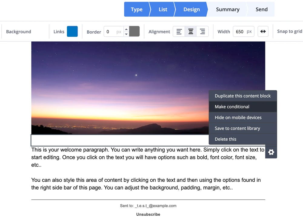 Wat ActiveCampaign goed heeft gedaan, is dat ze de geavanceerdere opties een laagje dieper hebben weggestopt. Zo kun je ‘conditional content’ toevoegen op basis van iemands profiel. Bijvoorbeeld dat mensen met de tag ‘klant’ geen kennismakingsaanbieding zien.