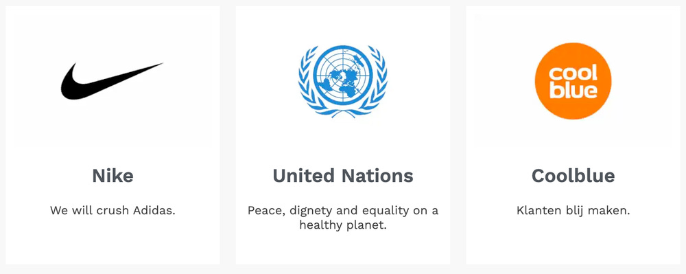 De BHAG van Nike (We will crush Adidas) sluit naadloos aan op de competitieve aard van het bedrijf. Maar deze BHAG zou absoluut niet passen bij de United Nations. Hun kernwaardes draaien om vrede en veiligheid. (United Nations: Peace, dignity, equality on a healthy planet).