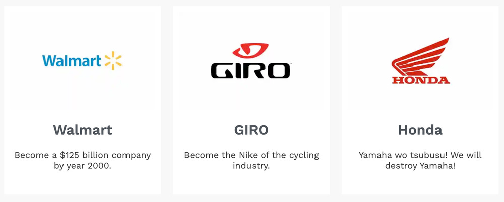 Als jong bedrijf zou je een grote naam als rolmodel kunnen zien. Een voorbeeld zou kunnen zijn “wij worden de Airbnb voor boten”. Een concreet voorbeeld is dat van GIRO sportkleding. Hun BHAG is ‘Become the Nike of the cycling industry‘.