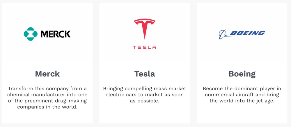 Een van die dingen was, dat de succesvolle bedrijven meestal een groot, gedurfd doel hadden dat zo diep in de organisatie was doorgedrongen dat iedereen binnen de organisatie eenvoudig in een paar woorden kon uitleggen wat de missie van het bedrijf was op de lange termijn.
