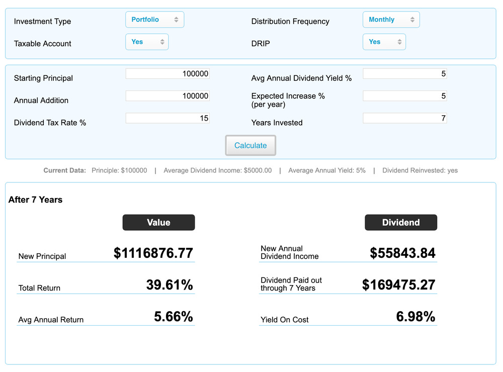 Ik heb berekend dat ik daarmee genoeg inkomsten genereer voor mijn pensioen, zoals je hieronder kunt zien. (berekend met deze tool)