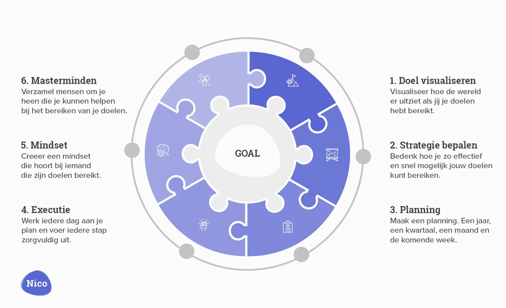 Met alleen doelen stellen en visualiseren kom je er niet. Je doelen bereiken vraagt om een strategie, een plan en natuurlijk het uitvoeren van het plan.
