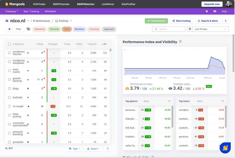 Als ik de content heb geproduceerd, voeg ik deze lijst met keywords toe aan Serpwatcher om te tracken hoe ik rank op deze keywords.