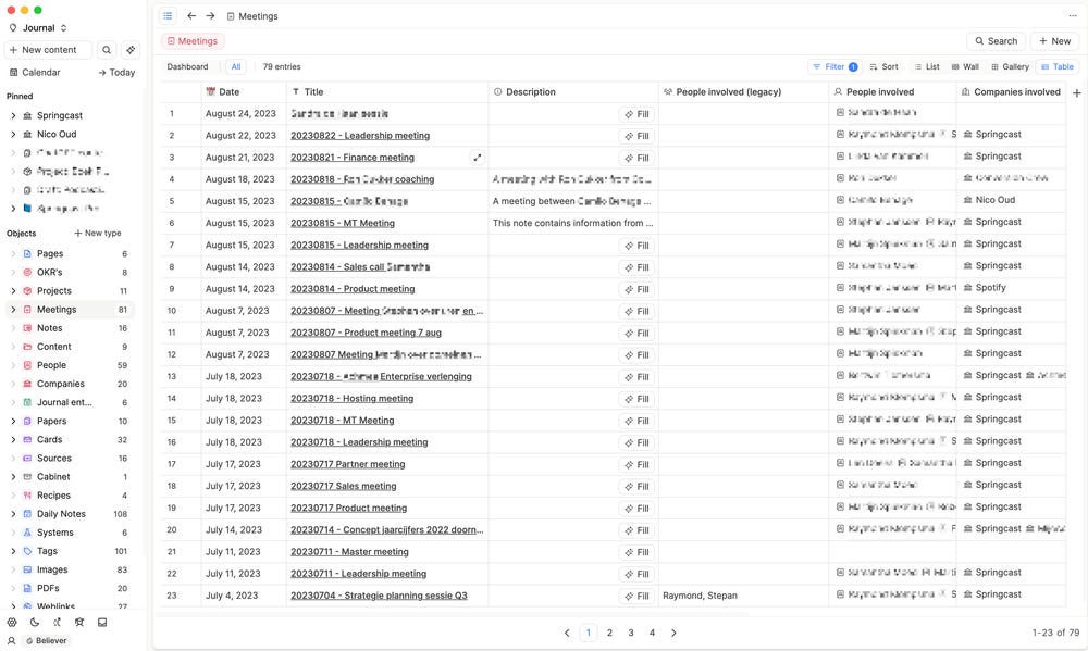 Op zich een heel slim idee, want je als je op zoek bent naar een meeting note, dan weet je wat voor type note het was. En daarmee kun in Capacities gerichter op zoek gaan naar die specifieke notities. Dit werkte tot op zekere hoogte erg goed voor mij en ik heb Capacities dan ook (voor mijn doen) lang gebruikt voor note taking.