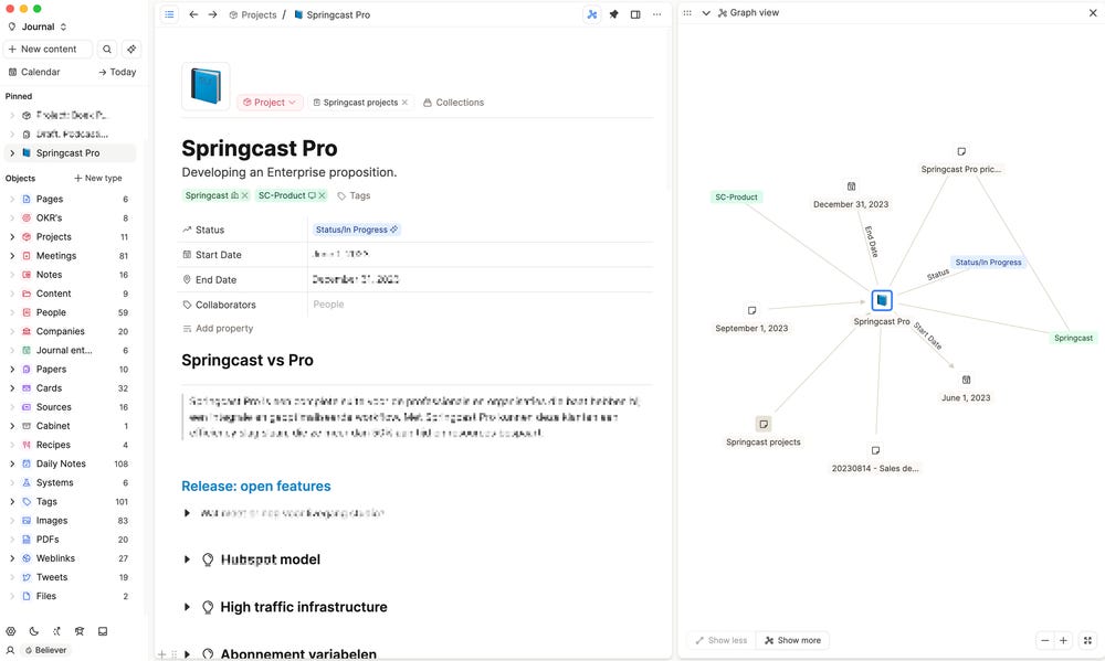 Notion is voor mij wat veel mensen een second brain noemen. Hier bewaar ik alle belangrijke informatie, zoals garantiebewijzen, etc. Ik gebruik het ook voor habit tracking, meeting notes, projectmanagement en voor PKM (personal knowledge management). Bij Springcast gebruiken we het nog steeds voor projectmanagement en bijv. onze interne kennisbank.