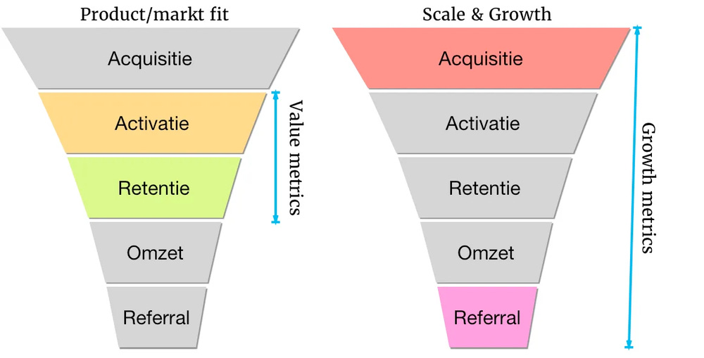 In de funnel weergave hieronder kun je goed het verschil zien tussen product/market fit metrics en de metrics die je gebruikt om te schalen.