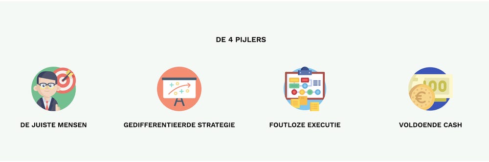 Feitelijk is de methode gebaseerd op 4 belangrijke pijlers, namelijk mensen, strategie, executie en cash.