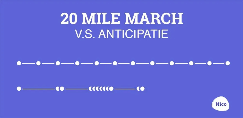 De 20 mile march moet passend zijn voor jou, het bedrijf, het team en de omstandigheden. Als je altijd 3 km rent op vlak terrein, is het niet verstandig om ineens 3 km te rennen op grote hoogte. Stabiel groeien vraagt dus om een geleidelijke overgang. Wanneer jouw team veel wisselt, heb je beperkte capaciteit. Een sprint willen trekken is dan wellicht onverstandig.