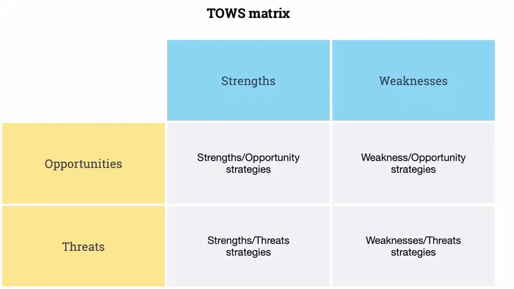 De TOWS matrix is een strategisch canvas dat bedrijven helpt om te anticiperen op sterktes, zwaktes, kansen en bedreigingen.