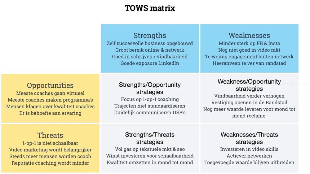 Ter illustratie heb ik hieronder een voorbeeld TOWS van mijn eigen business toegevoegd: